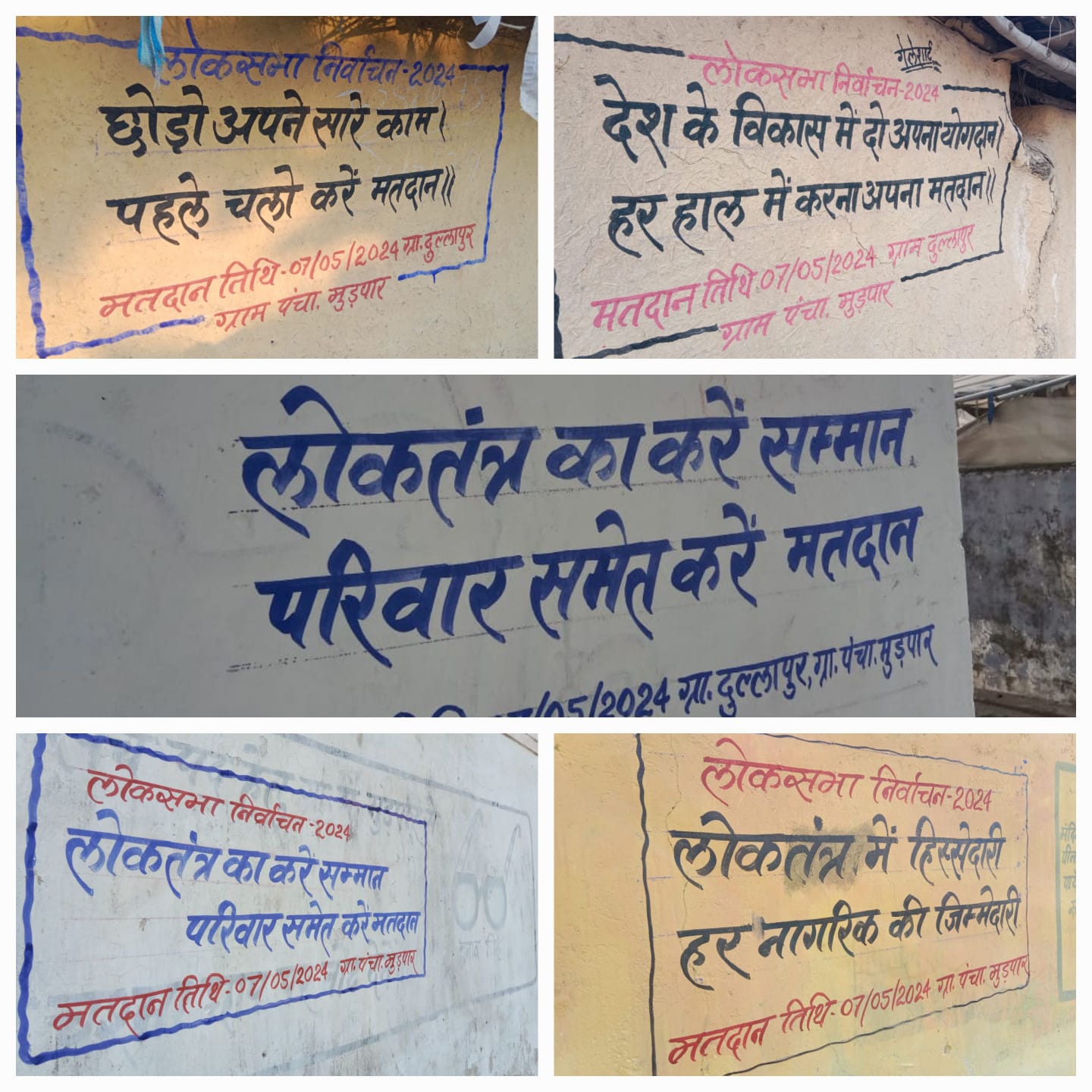 कलेक्टर एवं जिला निर्वाचन अधिकारी श्री आकाश छिकारा के निर्देशन एवं जिला पंचायत सीईओ एवं स्वीप नोडल अधिकारी श्री गोकुल कुमार रावटे के मार्गदर्शन में मतदान के लिए मतदाताओं को जागरूक करने के लिए दीवार लेखन किया जा रहा है।लोकतंत्र में हिस्सेदारी, हर नागरिक की जिम्मेदारी, मेरा वोट- मेरा संकल्प, मतदान केन्द्र जाऊँगा उज्जवल भविष्य बनाऊँगा, मेरा मत- मेरा अधिकार, छोड़ो अपने सारे काम। पहले चलो करें मतदान, देश के विकास में दो अपना योगदा हर हाल में करना अपना मतदान, लोकतंत्र का करें सम्मान परिवार समेत करें मतदान, परिवार समेत करे मतदान जैसे स्लोगन से मतदाताओं को किया जा रहा जागरूक।