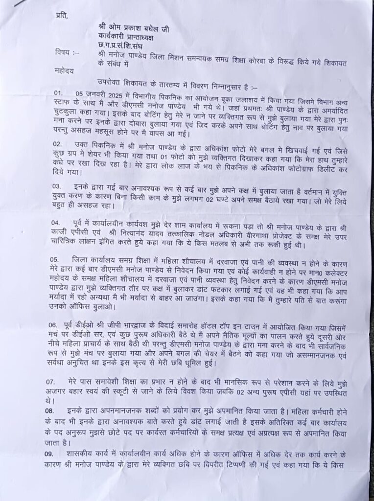 कोरबा, 21 जून/ जिला परियोजना समग्र शिक्षा कोरबा के जिला मिशन समन्वयक(डीएमसी ) मनोज पांडे के खिलाफ उनके मातहत समग्र शिक्षा कार्यालय में पदस्थ महिला सहायक परियोजना अधिकारी (एपीसी )के द्वारा गंभीर आरोप लगाते हुए उन पर हुई प्रताड़ना एवं चारित्रिक हनन सहित अन्य गंभीर आरोप लगाए गए हैं,तत सम्बन्ध मे उनके द्वारा छ ग शासन के राज्य महिला आयोग के साथ साथ जिला कलेक्टर,एवं मुख्य कार्यपालन अधिकारी जिला पंचायत कोरबा को भी शिकायत पत्र सौपी है और कार्यवाही की मांग की है।
