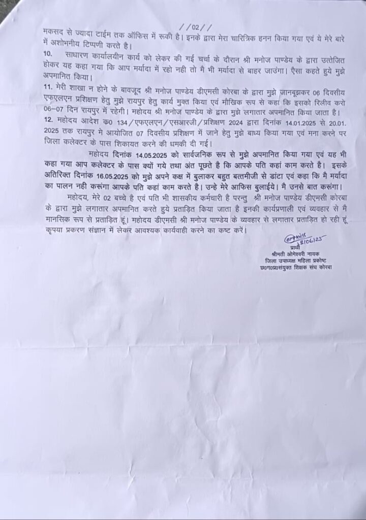 जिला परियोजना समग्र शिक्षा में कार्यरत सहायक परियोजना अधिकारी श्रीमती उमेश्वरी नायक जो की छत्तीसगढ़ प्रदेश संयुक्त शिक्षक संघ जिला कोरबा महिला प्रकोष्ठ के उपाध्यक्ष भी हैं।संघ के जिला स्तरीय पदाधिकारी के प्रति एवं अपने कार्यालय के ही मातहत महिला अधिकारी के प्रति डीएमसी मनोज पांडेय का यह व्यवहार विभागीय एवं कार्यालयिन गरिमा के सर्वथा विपरीत है जो कदाचार के श्रेणी मे आता है। जिला स्तर के एक विभाग प्रमुख का यह विपरीत चारित्रिक कार्यशैली किसी भी सूरत मे उचित प्रतीत नहीं होता।श्रीमती ओमेश्वरी नायक संयुक्त शिक्षक संघ के जिलास्तरीय महिला प्रकोष्ठ के पदाधिकारी होने के नाते उक्त घटना क्रम की शिकायत अपने संघ एवं अन्य प्रमुख संघोँ के राज्य प्रमुखों एवं जिला प्रमुखों को भी उनके ऊपर हुई प्रताड़ना, अत्याचार एवं पीड़ा की शिकायत, पत्र के माध्यम से भी अवगत करायी है।