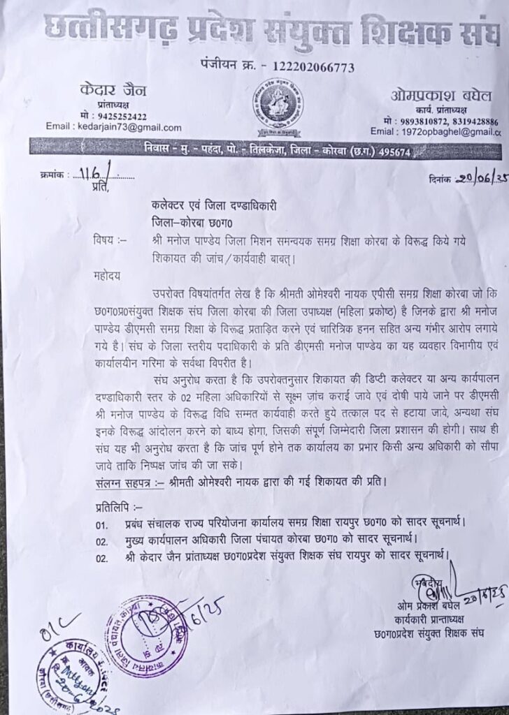 KORBA :समग्र शिक्षा के DMC मनोज पांडेय के विरुद्ध प्रताड़ना एवं चारित्रिक हनन समेत अन्य गंभीर आरोप,संयुक्त शिक्षक संघ ने कलेक्टर से की हटाने की मांग, अनदेखी पर आंदोलन की दी चेतावनी