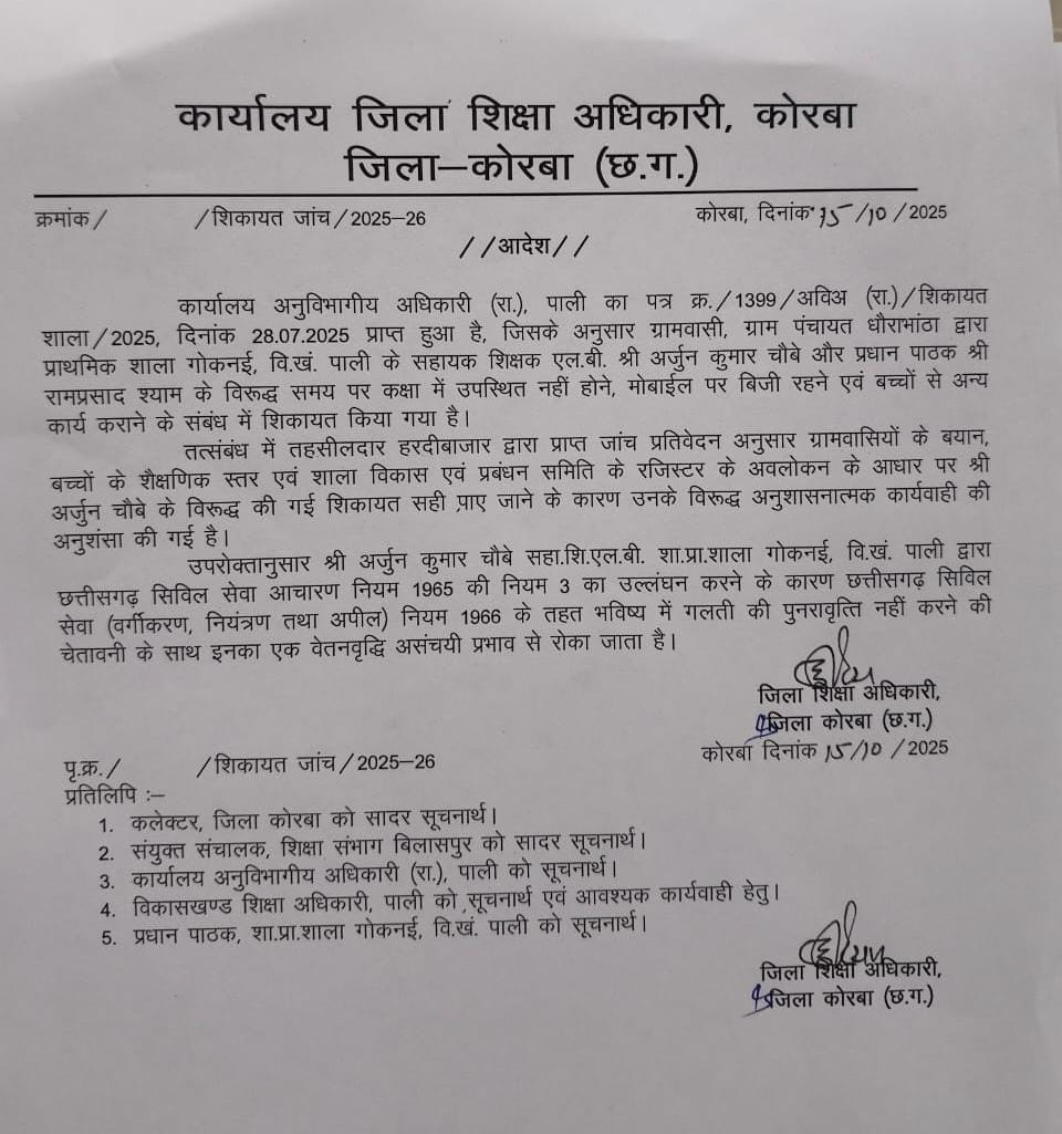 कोरबा। कार्यालय अनुविभागीय अधिकारी (राजस्व), पाली से प्राप्त जानकारी के अनुसार ग्राम पंचायत धौराभांठा के ग्रामीणों ने प्राथमिक शाला गोकनई के सहायक शिक्षक (एलबी) अर्जुन कुमार चौबे एवं प्रधान पाठक रामप्रसाद श्याम के विरुद्ध शिकायत दर्ज कराई थी। शिकायत में आरोप लगाया गया था कि दोनों शिक्षक समय पर कक्षा में उपस्थित नहीं रहते, मोबाइल पर व्यस्त रहते हैं तथा बच्चों से अन्य कार्य कराते हैं।