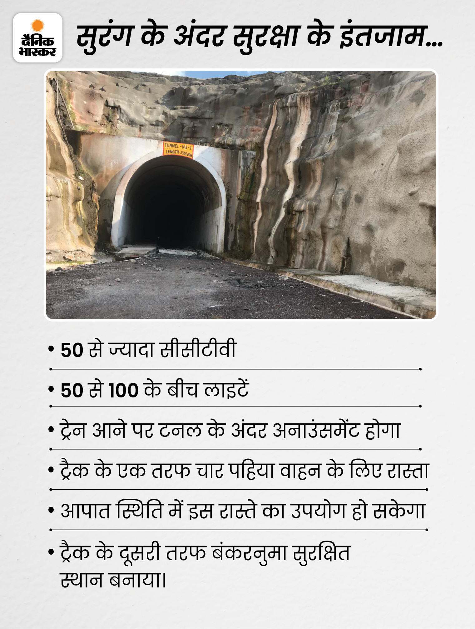 सुरंग के एक तरफ रीवा का गोविंदगढ़, तो दूसरी तरफ सीधी जिले का बघवार है। सुरंग के अंदर 50 से ज्यादा हाईटेक CCTV कैमरों से​ निगरानी होगी। लाइटिंग के लिए अलग-अलग तरह की 50 से 100 हाई मास्ट लाइट भी लगाई जाएंगी। एहतियात के तौर पर यात्रियों की सुरक्षा के लिए बंकर बनाए गए हैं। यदि रेल गाड़ी सुरंग के अंदर रुक जाएगी तो तुरंत कंट्रोल रूम को अलर्ट का मैसेज जाएगा। साथ ही जगह-जगह अनाउंसमेंट की भी व्यवस्था की गई है।
