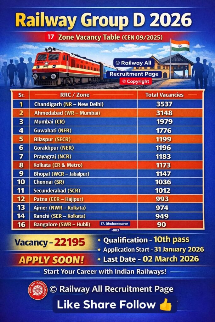 भारतीय रेलवे में सरकारी नौकरी की तैयारी कर रहे युवाओं के लिए बड़ी खुशखबरी है। रेलवे ग्रुप डी भर्ती 2026 के तहत देशभर के 17 रेलवे ज़ोन में कुल 22,195 पदों पर भर्ती की प्रक्रिया शुरू होने जा रही है। यह भर्ती सेंट्रलाइज्ड एम्प्लॉयमेंट नोटिस (CEN 09/2025) के अंतर्गत आयोजित की जाएगी। आवेदन प्रक्रिया 31 जनवरी 2026 से शुरू होगी, जबकि आवेदन करने की अंतिम तिथि 2 मार्च 2026 निर्धारित की गई है।
