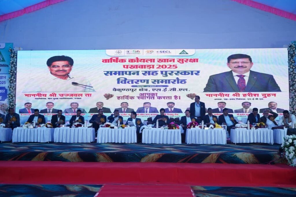 बैकुंठपुर। एसईसीएल बैकुंठपुर क्षेत्र में वार्षिक कोयला खान सुरक्षा पखवाड़ा–2025 का समापन-सह-पुरस्कार वितरण समारोह 18 जनवरी 2026 को भव्य एवं गरिमामय वातावरण में सफलतापूर्वक सम्पन्न हुआ। इस अवसर पर खनन क्षेत्र में सुरक्षा को लेकर किए जा रहे प्रयासों, नवाचारों और उपलब्धियों को साझा किया गया तथा उत्कृष्ट कार्य करने वाले अधिकारियों, कर्मचारियों और टीमों को सम्मानित किया गया।