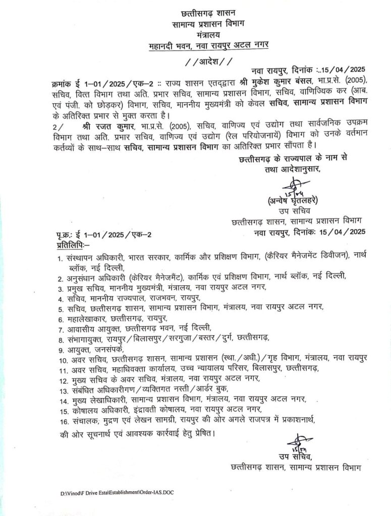 छत्तीसगढ़: IAS अफसरों को लेकर आदेश जारी, मुकेश बंसल को सामान्य प्रशासन विभाग से हटाकर रजत कुमार को अतिरिक्त प्रभार