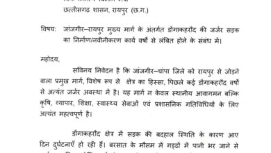 बदहाल सड़क की समस्या को लेकर महिला कांग्रेस की प्रदेश सचिव रोमा परसराम भारद्वाज ने लिखा उप मुख्यमंत्री अरुण साव को पत्र
